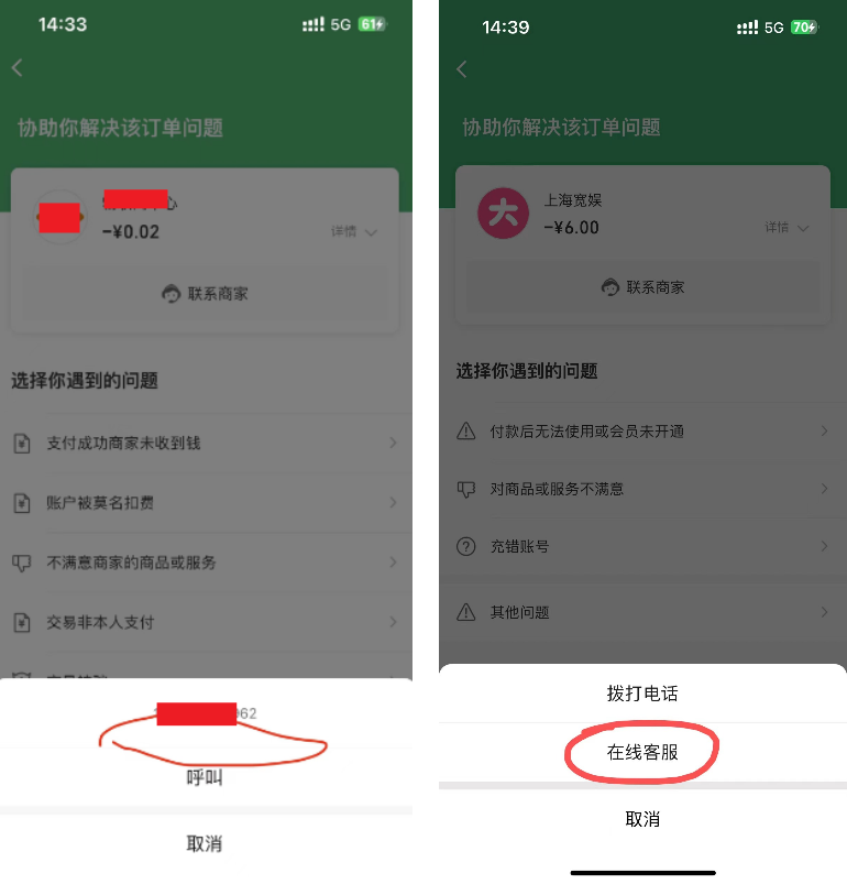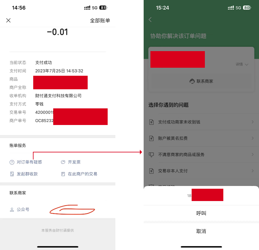 1. 已经在微信商户平台设置过客服电话,且已经验证过了,但是下图1画红框的位置为什么不显示“商家电话”,点击图1的“对订单有疑惑”按钮进入的页面(下图2)都有商家电话,按我理解的两个页面要有商家电话都有,为什么一个页面有商家电话一个页面没有?在哪里设置能将下图1的商家电话给显示出来?