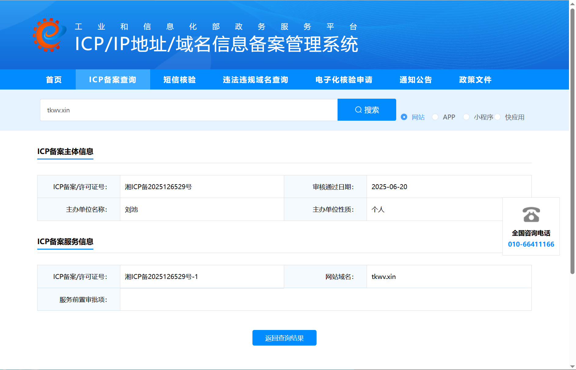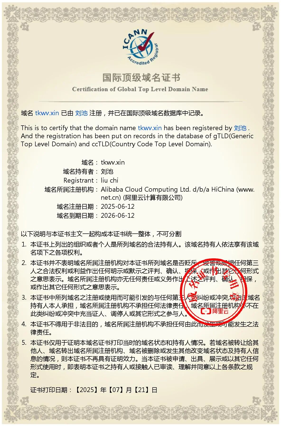 域名信息:域名 tkwv.xin 已由 刘池 注册,并已在国际顶级域名数据库中记录。