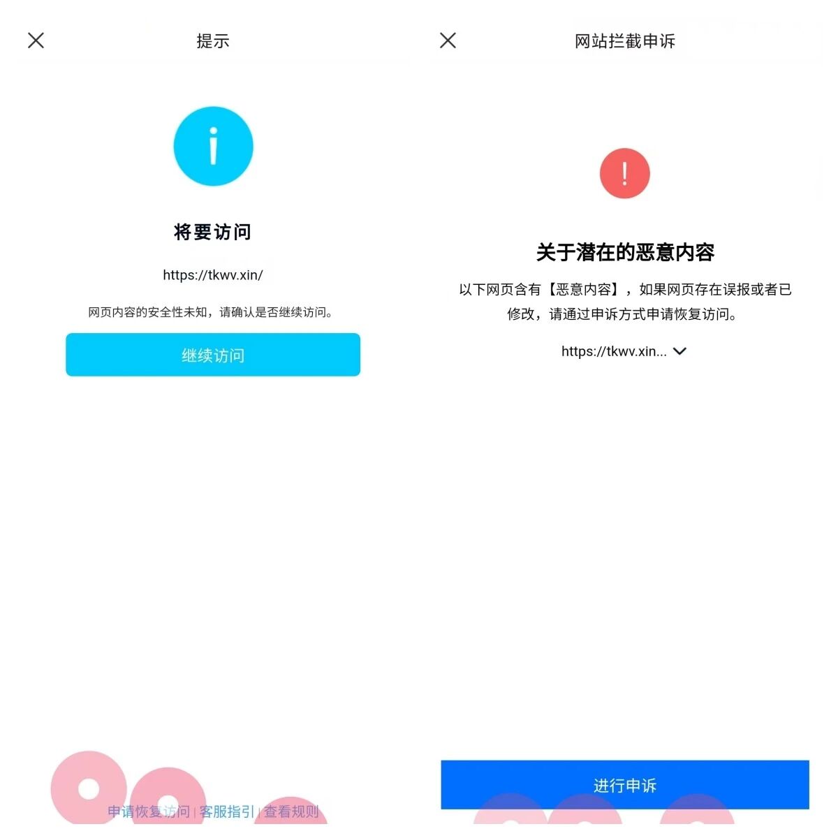 QQ提醒:1,网页内容的安全性未知,请确认是否继续访问。2,以下网页含有【恶意内容】,如果网页存在误报或者已修改,请通过申诉方式申请恢复访问。 第二个页面是必须由第一个页面点击恢复之后,才会出现第二个页面。