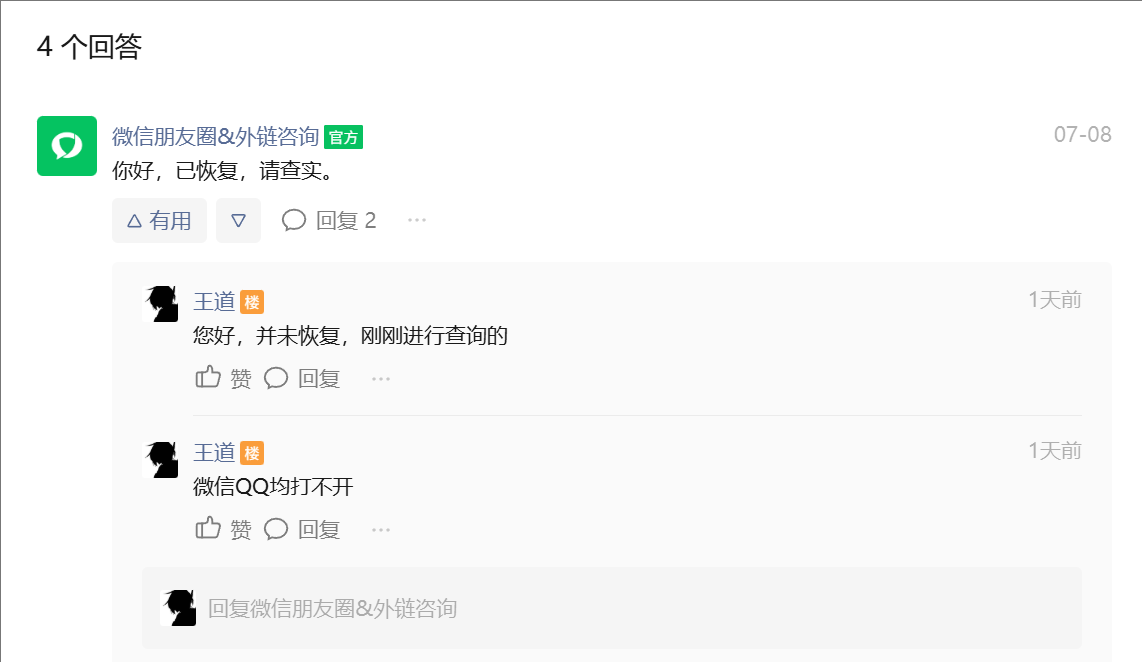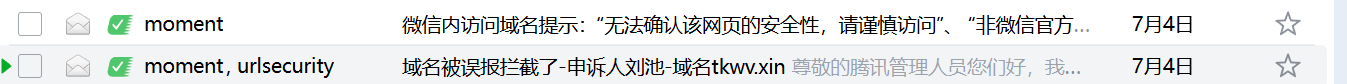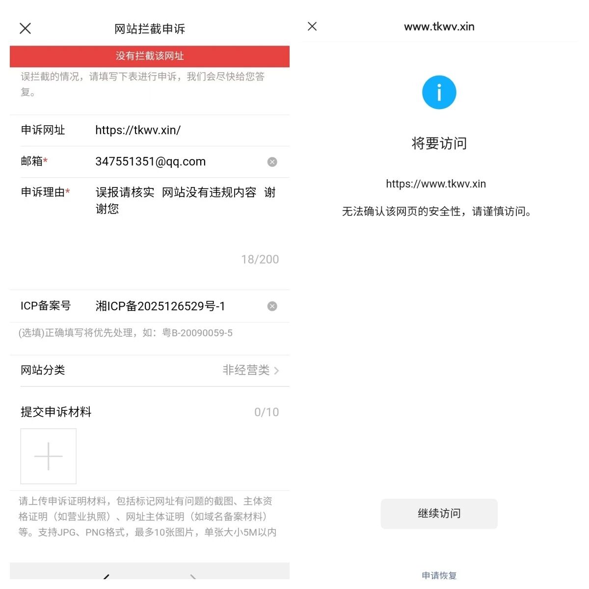 问题详情:QQ拦截,微信拦截,微信已申诉无反应,QQ申诉入口点进去提交申诉的时候提示未拦截,导致无法申诉,去安全中心检测也是提示暂未发现风险,本人已于7月4日在微信社区发表反馈文章,7月8日被工作人员告知已经恢复,到目前2025年7月21日01:14,QQ微信均未解除对我的拦截,特此又一次反馈给相关工作人员,希望可以对我个人域名给予解除限制,谢谢。