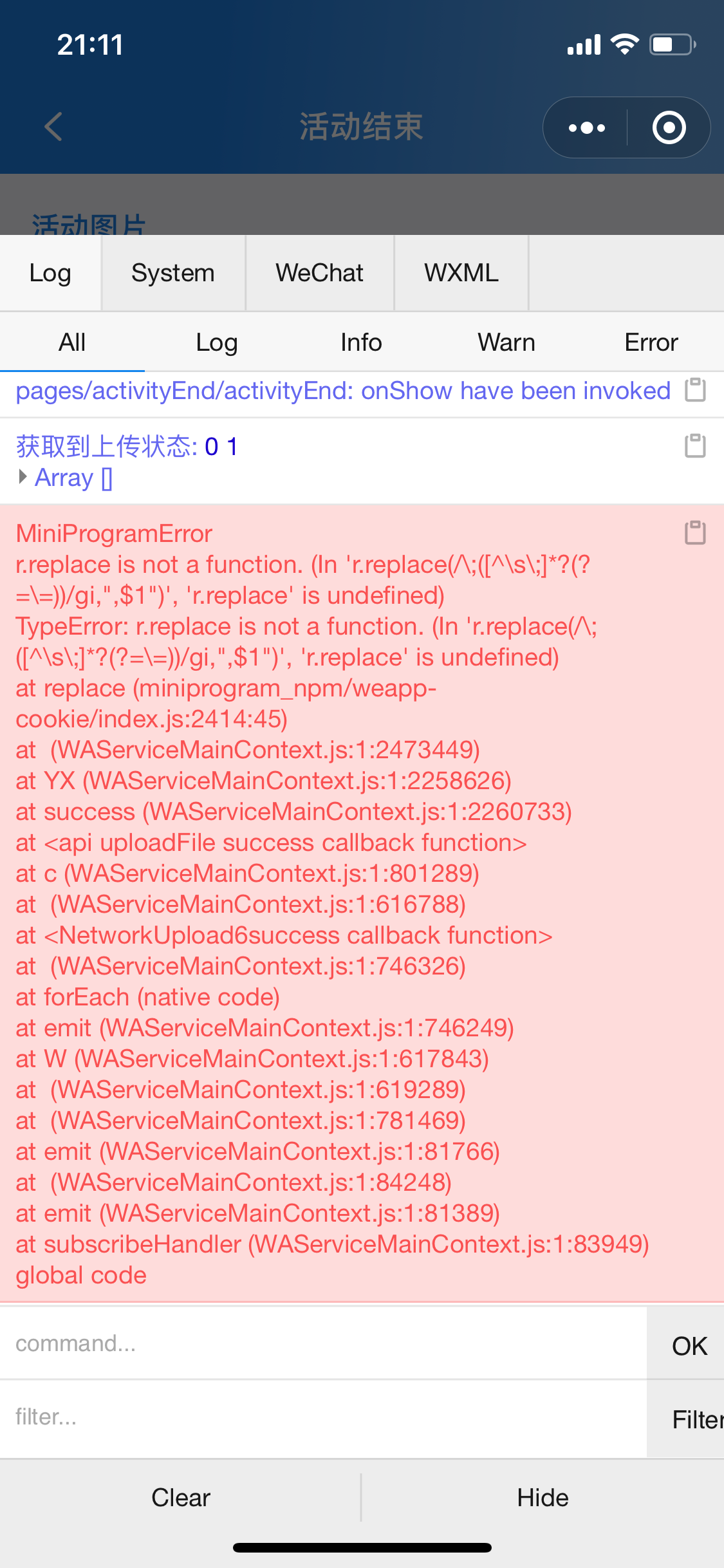 "MiniProgramError\nr.replace is not a function. (In 'r.replace(/\;([^\s\;]*?(?=\=))/gi,",$1")', 'r.replace' is undefined)\nTypeError: r.replace is not a function. (In 'r.replace(/\;([^\s\;]*?(?=\=))/gi,",$1")', 'r.replace' is undefined)\nat replace (miniprogram_npm/weapp-cookie/index.js:2414:45)\nat (WAServiceMainContext.js:1:2473449)\nat YX (WAServiceMainContext.js:1:2258626)\nat success (WAServiceMainContext.js:1:2260733)\nat <api uploadFile success callback function>\nat c (WAServiceMainContext.js:1:801289)\nat (WAServiceMainContext.js:1:616788)\nat <NetworkUpload1success callback function>\nat (WAServiceMainContext.js:1:746326)\nat forEach (native code)\nat emit (WAServiceMainContext.js:1:746249)\nat W (WAServiceMainContext.js:1:617843)\nat (WAServiceMainContext.js:1:619289)\nat (WAServiceMainContext.js:1:781469)\nat emit (WAServiceMainContext.js:1:81766)\nat (WAServiceMainContext.js:1:84248)\nat emit (WAServiceMainContext.js:1:81389)\nat subscribeHandler (WAServiceMainContext.js:1:83949)\nglobal code"