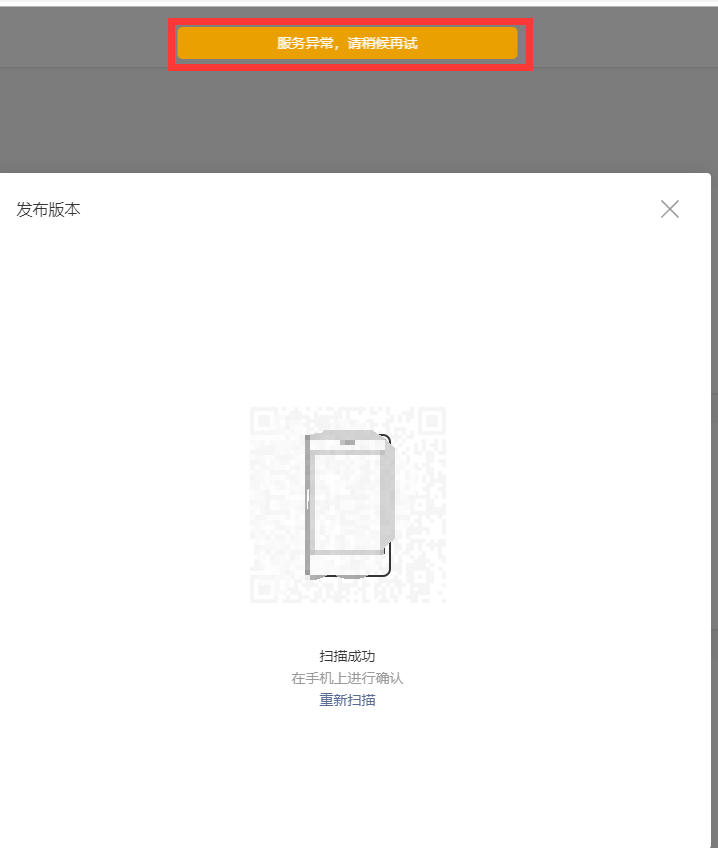 先打开微信把扫码功能打开,然后点发布版本,二维码一出来立马扫,进去后马上点确定发布,就可以了。这个原因好像是生成二维码之后,页面会一直请求一个url,但是n次后就会失败。在失败前点确定就能发布出去。