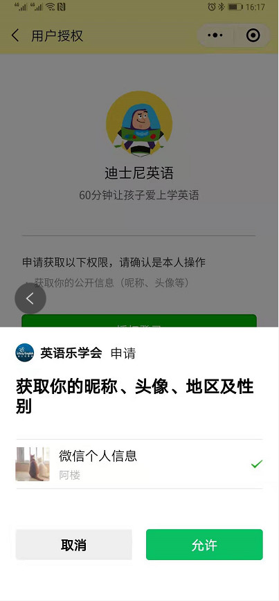 弹出“获取获取你的昵称、头像、地区及性别”的提示框
