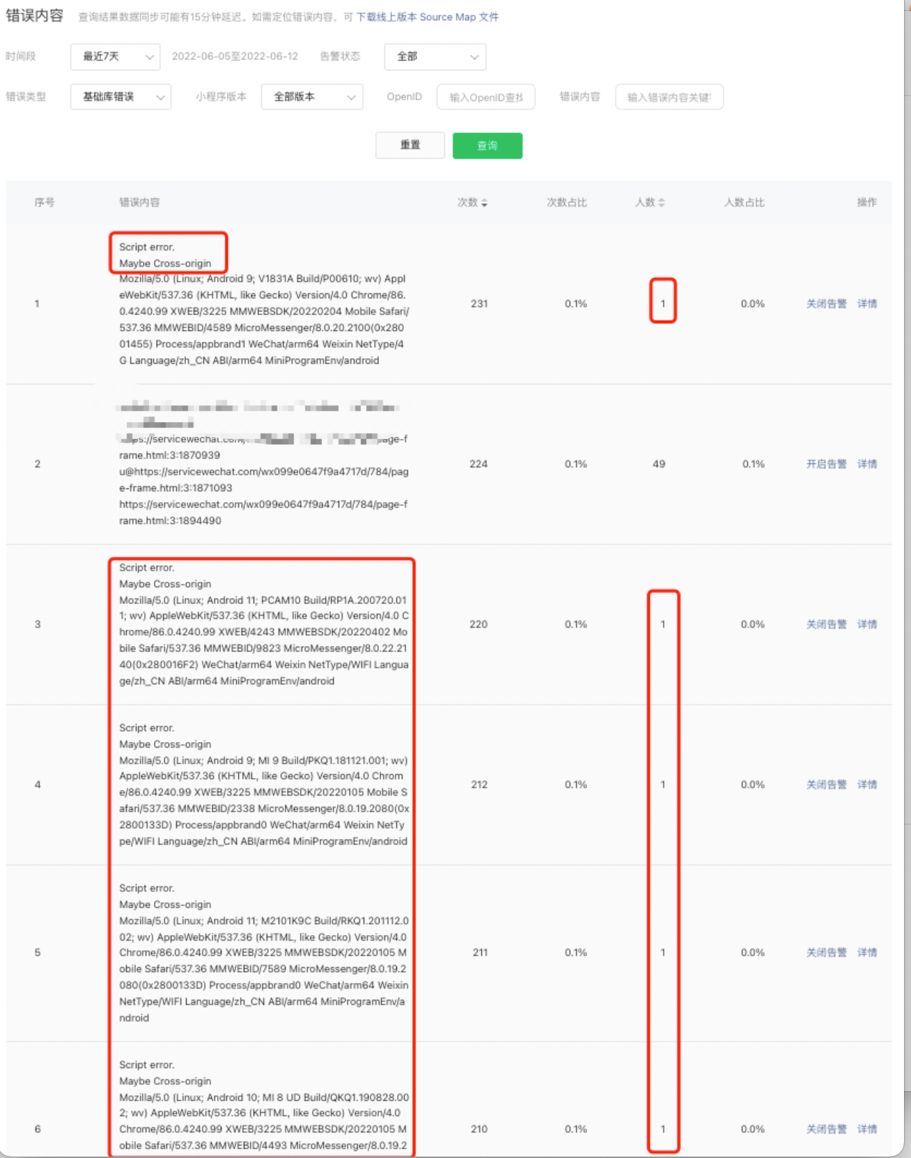 小程序告警群一直有Script error. 的告警信息,但是后台查到的信息无法帮忙排查,能看到的基本是安卓设备,且影响用户为1,需要官方大大帮忙看看这个问题怎么排查 或者社区大佬有人知道吗