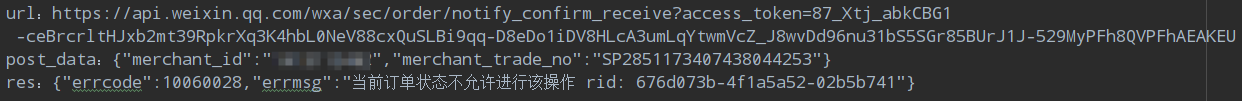 调用小程序发货信息管理服务中的查询订单发货状态接口,且已确认该订单在信息管理平台能查到的,但接口却提示{"errcode":10060028,"errmsg":"当前订单状态不允许进行该操作 rid: 676d073b-4f1a5a52-02b5b741"}