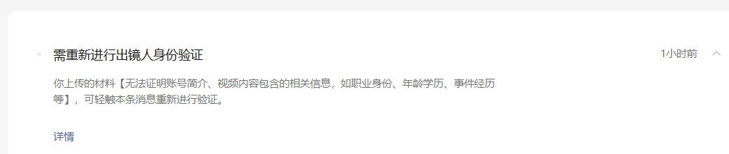 你上传的材料【无法证明账号简介、视频内容包含的相关信息,如职业身份、年龄学历、事件经历等】,可轻触本条消息重新进行验证。想问下是简介问题吗?