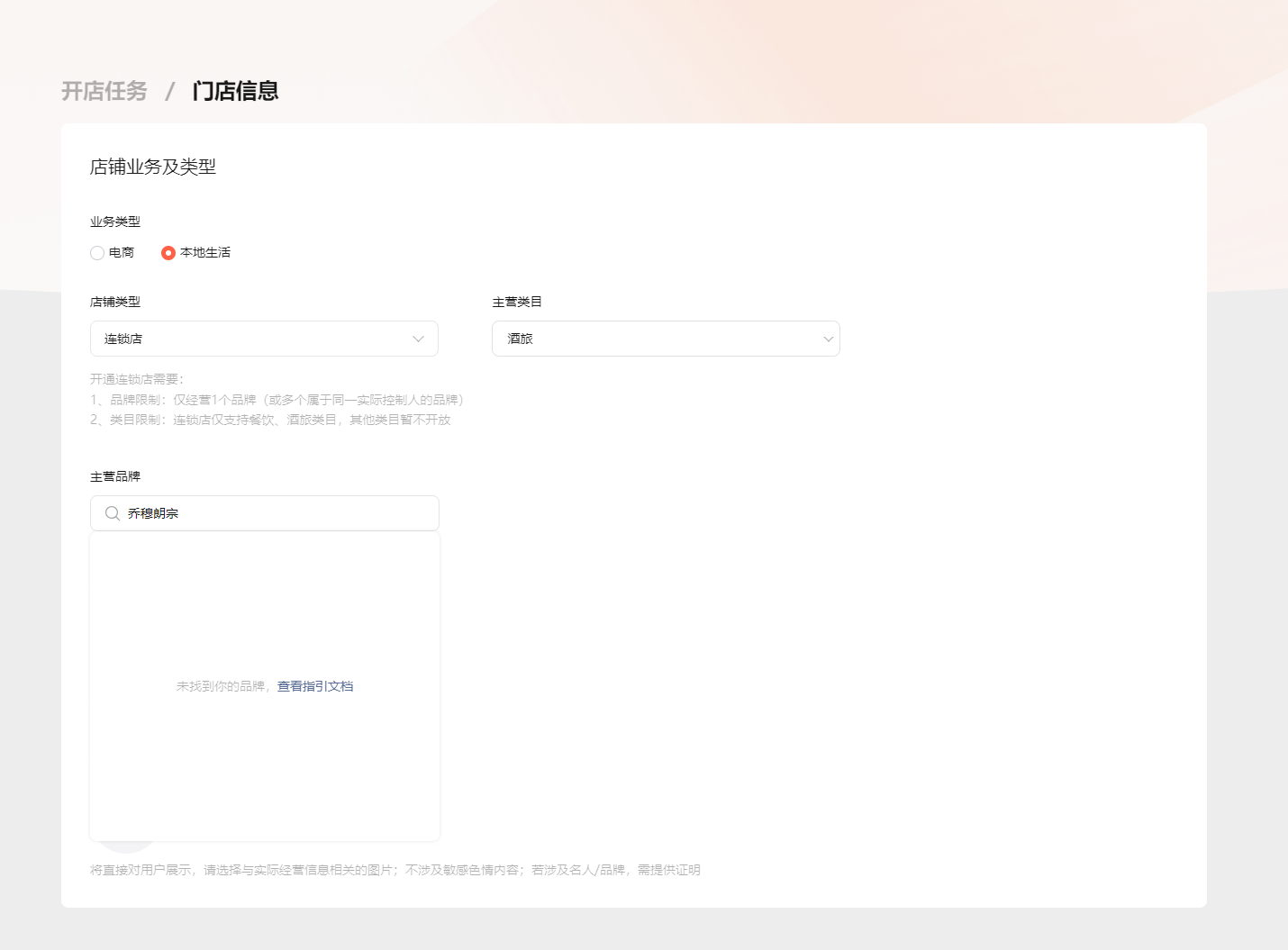 来一间是微信服务市场旅游住宿版块核心运营商,目前有很多酒店旅游商家合作,应商家要求,目前急需帮助他们开通视频号本地生活小店,进行视频号的推广,当前我们的客户开通本地生活小店,资质各方面都满足,但是在申请连锁小店类型的情况下,主营品牌,无法搜索到自己的品牌,也无法新增品牌,无法入驻,麻烦相关人士联系帮我们解决这个问题?