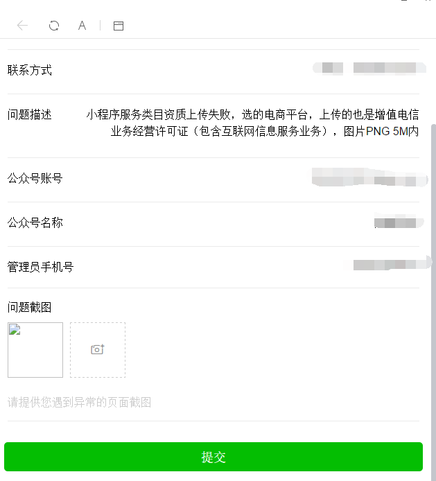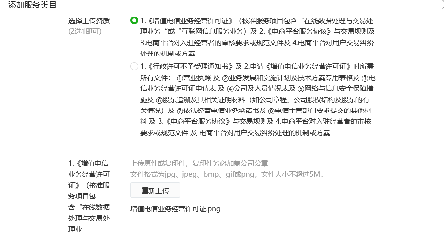 - 小程序服务类目资质上传失败,选的电商平台,上传的也是增值电信业务经营许可证(包含互联网信息服务业务),资质与当前小程序主体一致,图片PNG/JPG都试过, 5M内,IE/谷歌浏览器都不行。