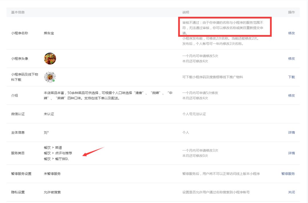在修改小程序名称(《乘车宝》修改为《丁点香麻辣香锅》)的时候,消息一直通知:申请的名称与小程序的服务范围不符。
