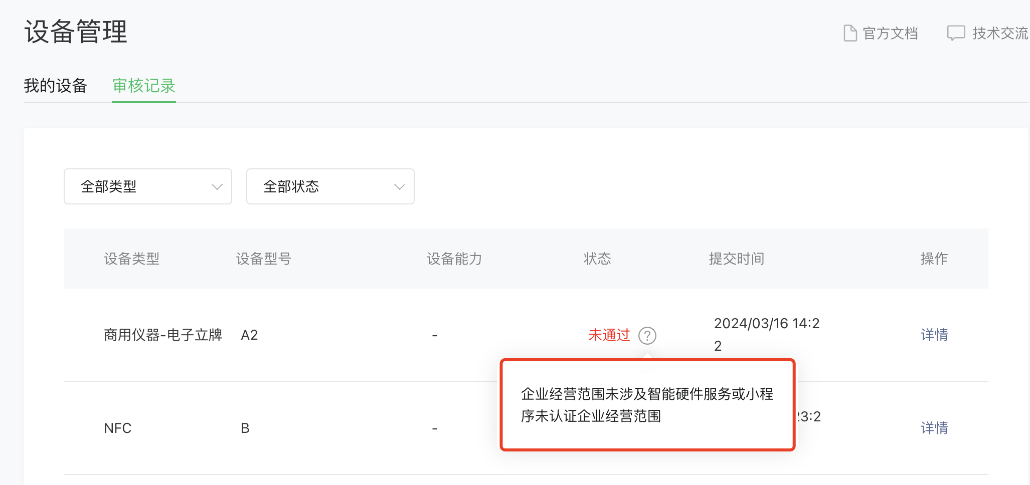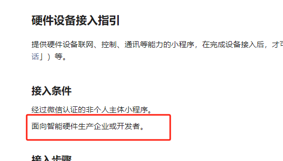 问题:根据官方的教程(https://developers.weixin.qq.com/miniprogram/dev/framework/open-ability/NFC.html),需要先注册硬件设备,但注册时提示“企业经营范围未涉及智能硬件服务”,难道非智能硬件企业的小程序就不能被NFC调起么?