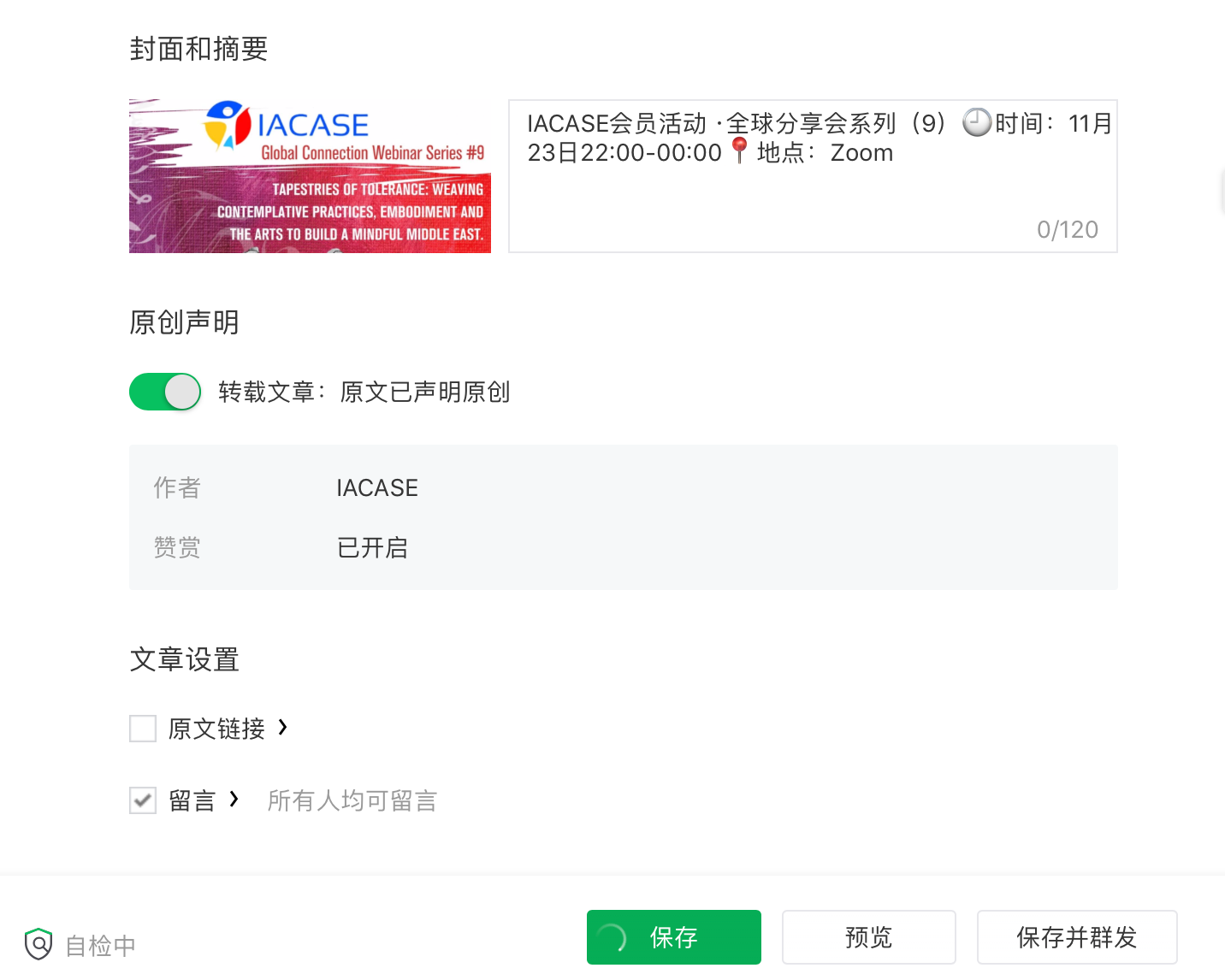 1、这篇是转载的内容,一直显示“自检中……”,点击保存和群发按钮则一直转圈圈