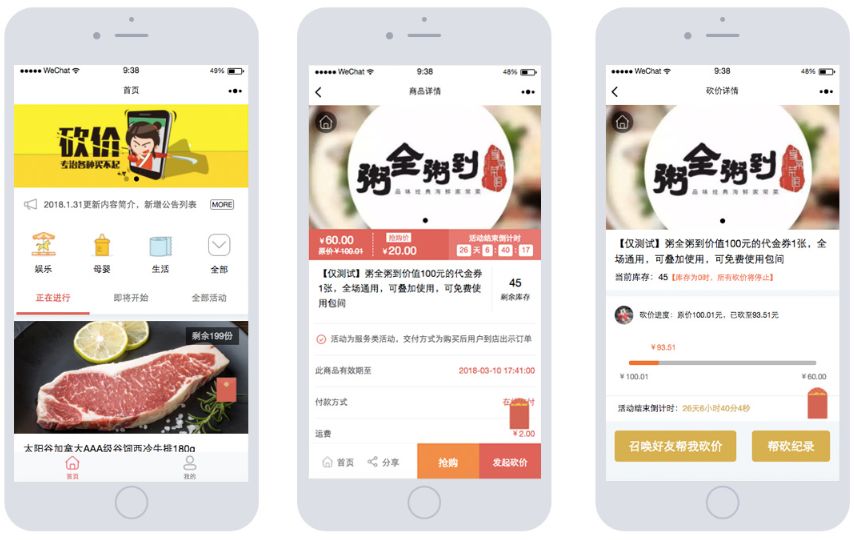 后来觉得还是再试试其他的吧,就又做了第二款“砍价商城的小程序”,可以用来卖自己的商品,不用入驻第三方平台交押金,也支持砍价,挺好的。第三款是我接的一个外包,是一家企业商户要做一个门店预约小程序,我接了一单,赚了一万多块钱,第一次在微信小程序上赚了点钱。