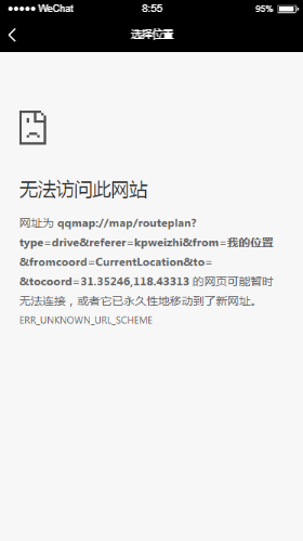 在微信web开发工具中使用wx.openLocation可以打开查看当前位置,但是无论点击“查看周边”还是“去这里”都会跳出无法访问此网站错误。