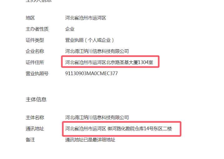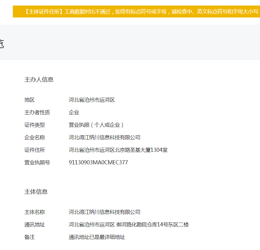 你是变更过主体地址吧。点击【上一步】。。。【上一步】,直到出现【取消】按钮,点击【取消】按钮,进入备案第一页可以上传最新营业执照与填写主体地址页面,重新上传营业执照与填写最新地址。