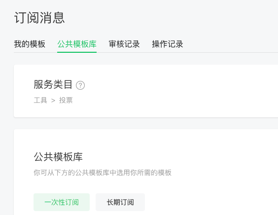 长期订阅,根据程序类目,选择的模板比较少,自己申请可能不那么好通过,使用时只需要用户点击一次就可以,一直发订阅了,而且可以在小程序右上角三个点,打开设置,手动选择接收或关闭订阅,这里好像只显示长期的模板。