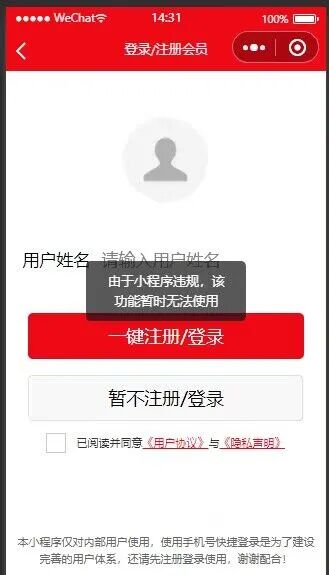目前小程序注册还是提示“由于小程序违规,该功能暂时无法使用”?已根据隐私要求整改完毕,但也找不到隐私入口呢,请问怎么解封?