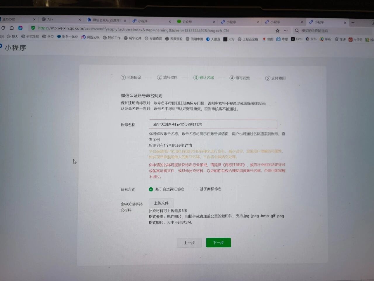 小程序注册认证,在确认名称环节,输入账号名称后需要提供商标注册证或其他证明材料,但是我们没有。应该怎么办?