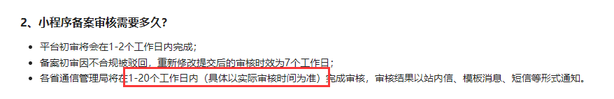 你好,小程序备案审核暂不支持加急,各省通信管理局将在1-20个工作日内(具体以实际审核时间为准)完成审核,请耐心等待审核,审核结果会以站内信、模板消息、短信等形式通知到小程序管理员。