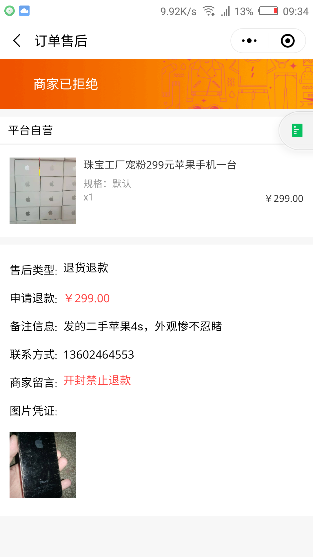 在小程序买东西,收到快递第一时间打开看,看到寄来的二手机并且是已经淘汰的苹果4s手机,还没确认收货,第一时间申请退款退货,第二天商家拒绝,说开封不退,这本来就是二手机,包装真没简陋,就一个手机盒装着,什么膜都没有。反馈平台平台客服介入也支持退款,商家也不处理,现在平台已完结,商家也没处理,我要怎么样才能拿回退款的钱💰