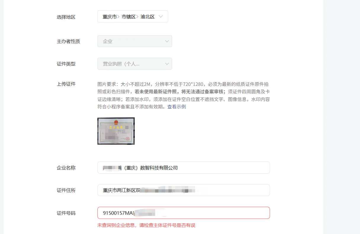 你好,证件号报错问题与填写的省市区地址无关,请核实当前填写证件号是否一致,若一致,请排查当前企业是否为新建企业,若为新建企业工商数据更新可能会有延期,建议等待一段时间(5~15个工作日)后再尝试提交备案。