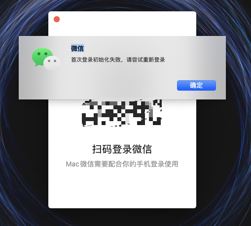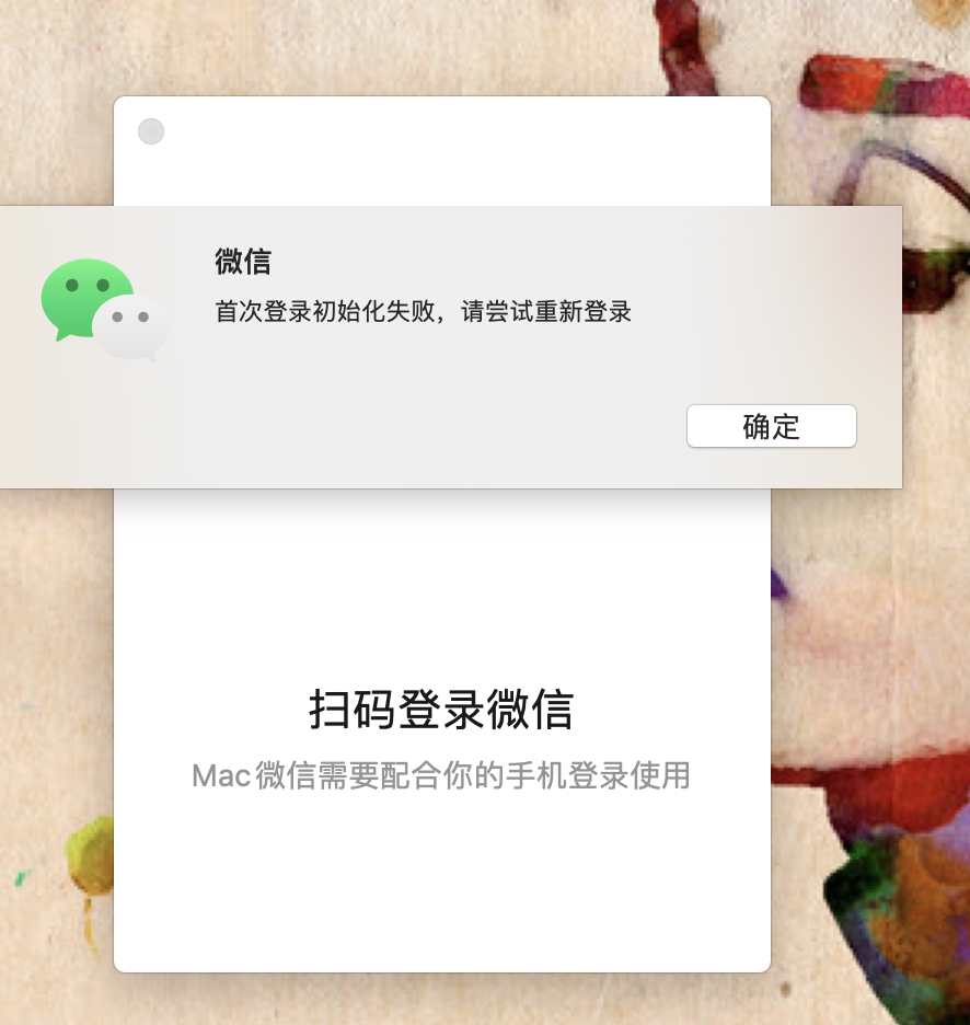 我也是Mac电脑,重装了系统,然后登录微信客户端,扫码登录登录不上去,我其中一个微信朋友少一点的微信能登录上去,一个加了很多人的微信登录不上去,加载到50%左右,就显示微信初始化失败,请重新登录,尝试了很多个方法,都没解决,求微信官方给解药,fuck!!!