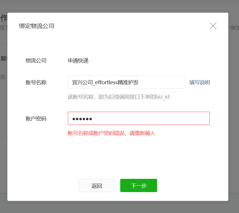 和申通那边确定过账号名称和账户密码都没有问题,但是一直提示有错误,请问怎么解决?