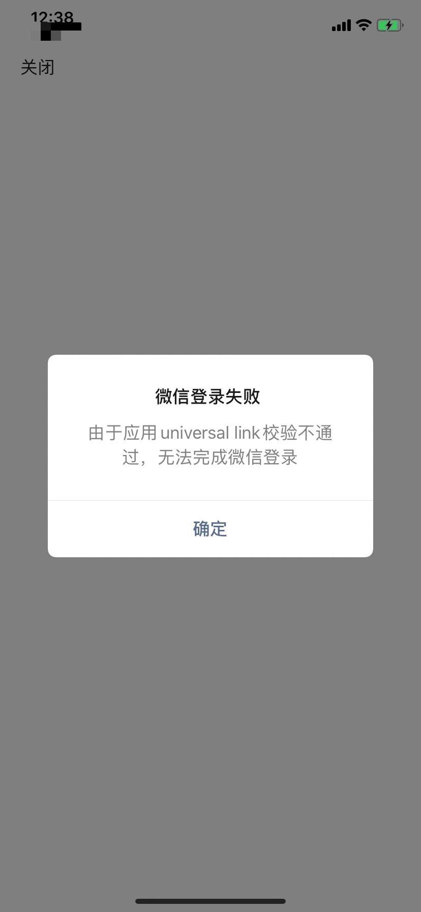 请问我的universal link一直失败,无论怎么配置都是这样,麻烦帮忙查下是什么原因,而且分享链接也提示"未认证应用", 版本是SDK1.8.7.1,APPID是wx9a1765faa2d86ec7 [AppDelegate application:didFinishLaunchingWithOptions:]_block_invoke_2> Print: WeChatLog == 5, 0, Universal Link check failed. The application is launched by WeChat via scheme, Common problems self-check guide: [\M-e\M->\M-.\M-d\M-?\M-!\M-e\M-<\M^@\M-f\M^T\M->\M-e\M-9\M-3\M-e\M^O\M-0App iOS\M-g\M-+\M-/\M-f\M^N\M-%\M-e\M^E\M-%\M-f\M^V\M-0\M-g\M^I\M^H\M-f\M^\\M-,SDK \M-e\M-8\M-8\M-h\M-'\M^A\M-i\M^W\M-.\M-i\M-"\M^X\M-h\M^G\M-*\M-f\M^_\M-%\M-f\M^L\M^G\M-e\M-<\M^U]https://developers.weixin.qq.com/community/develop/doc/000ce0403bc9d0ea1a0a67f415b409