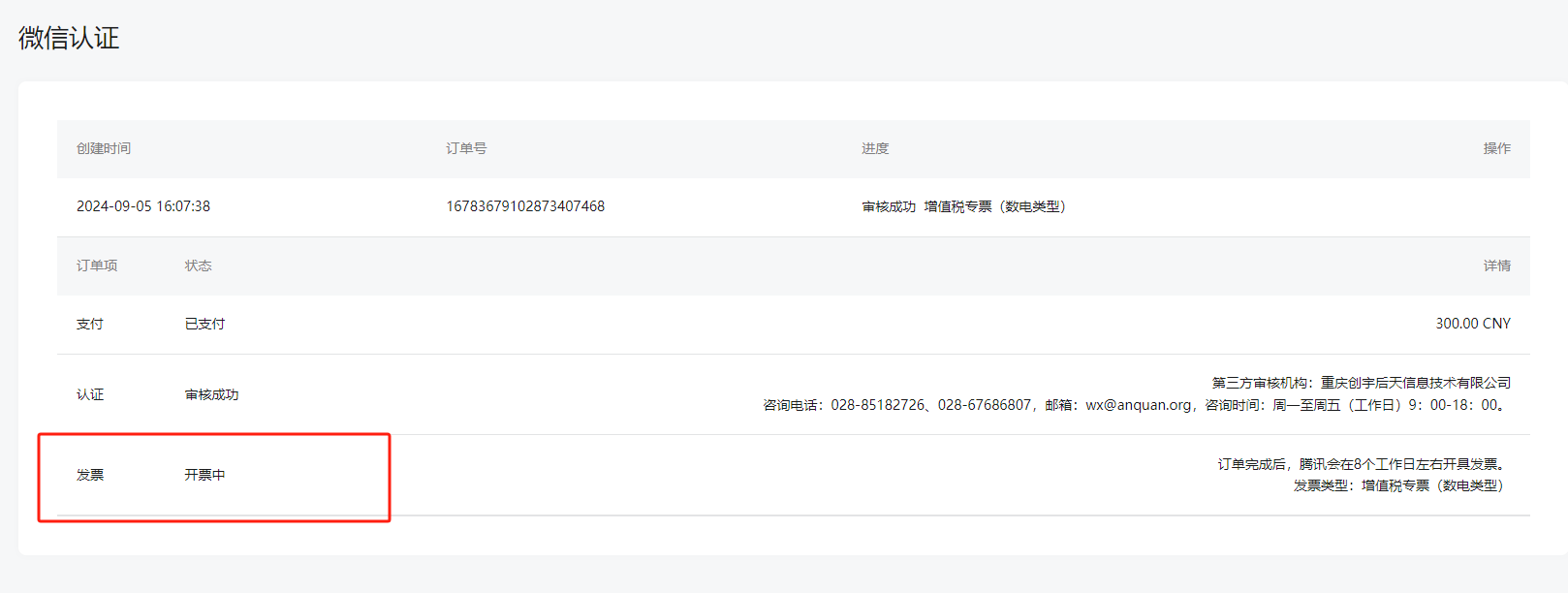 9月5号完成的认证,发票还没开。原始ID:gh_2b2280836710