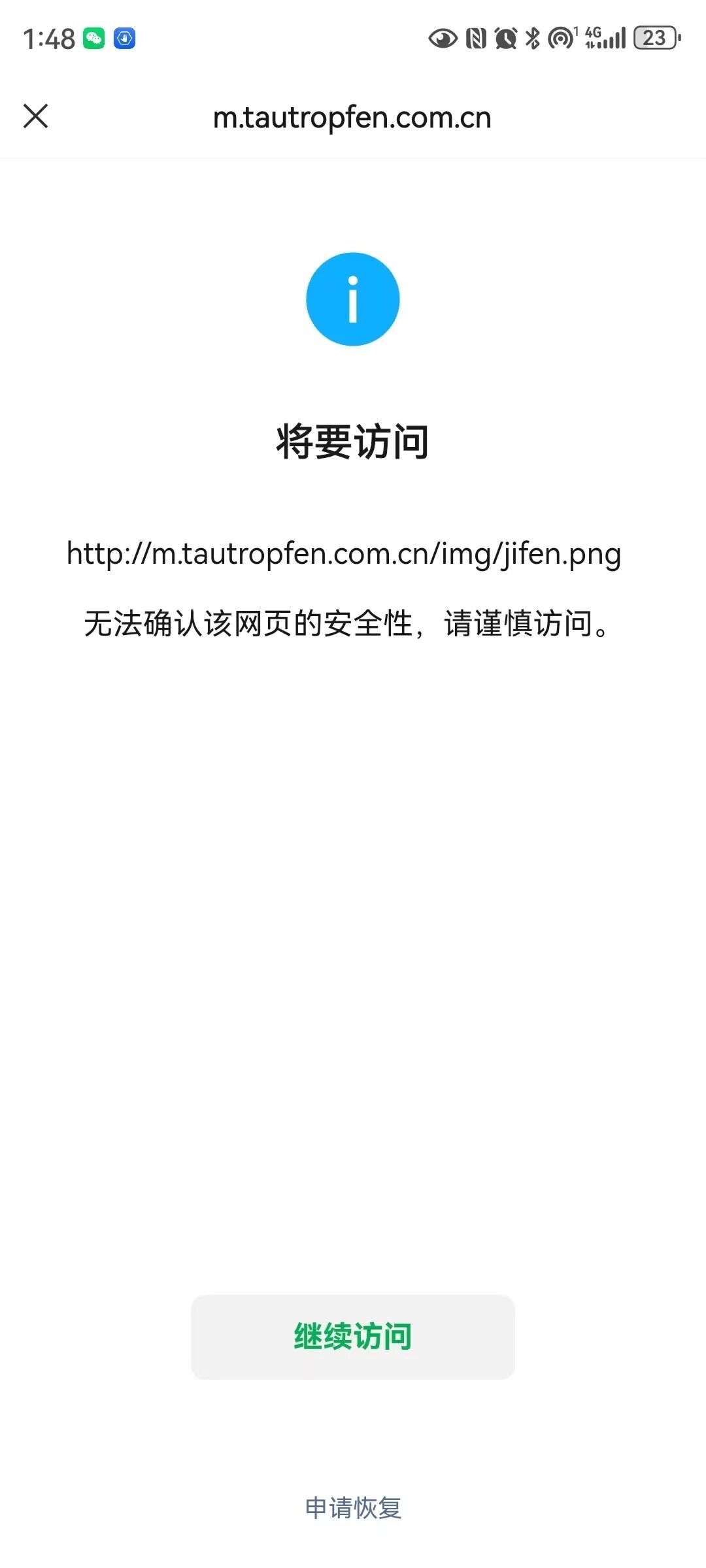 在微信中访问该域名内容,如图片:http://m.tautropfen.com.cn/img/jifen.png,提示无法确认该页面的安全性,请谨慎访问。请求官网恢复。