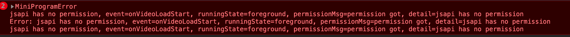 Error: jsapi has no permission, event=onVideoLoadStart, runningState=foreground, permissionMsg=permission got, detail=jsapi has no permission