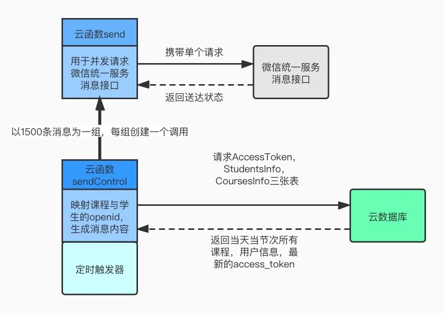 完全基于云开发的能力,我们用了以下的方式实现在一分钟内对近1.7万名同学的课程信息进行筛选并用模板消息定向发送给同学。