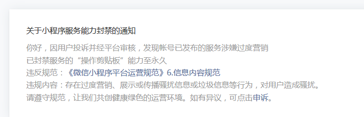 2018.9.25号被告知小程序涉嫌国度营销违反规范并永久封禁了“操作剪贴板”能力,