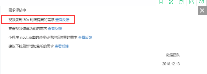 兄dei,这个这个。1207-1204的反馈中,有一个“视频录制30s时限提高的需求”,如下图。我每周都会看看新的反馈结果,然而它就这么的不见了。求找回