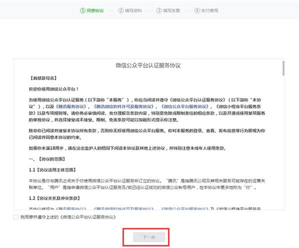 第一步:签署《微信公众平台认证服务协议》,勾选同意,点击下一步。