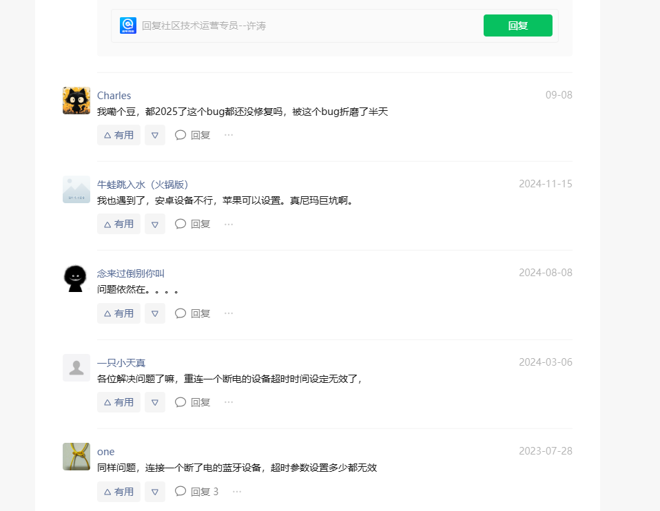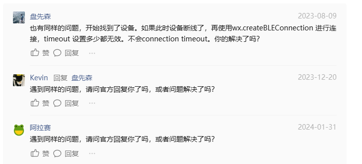 实际场景,用户已经在程序里边添加了蓝牙设备,后续用户使用蓝牙功能的时候忘记打开蓝牙设备的电源,尝试连接设备的时候,虽然设置了超时时间,但因为安卓设备超时时间配置无效,只能让用户等30秒才能进入fail里边提示用户连接失败。安卓和IOS表现不一致影响用户体验流程。