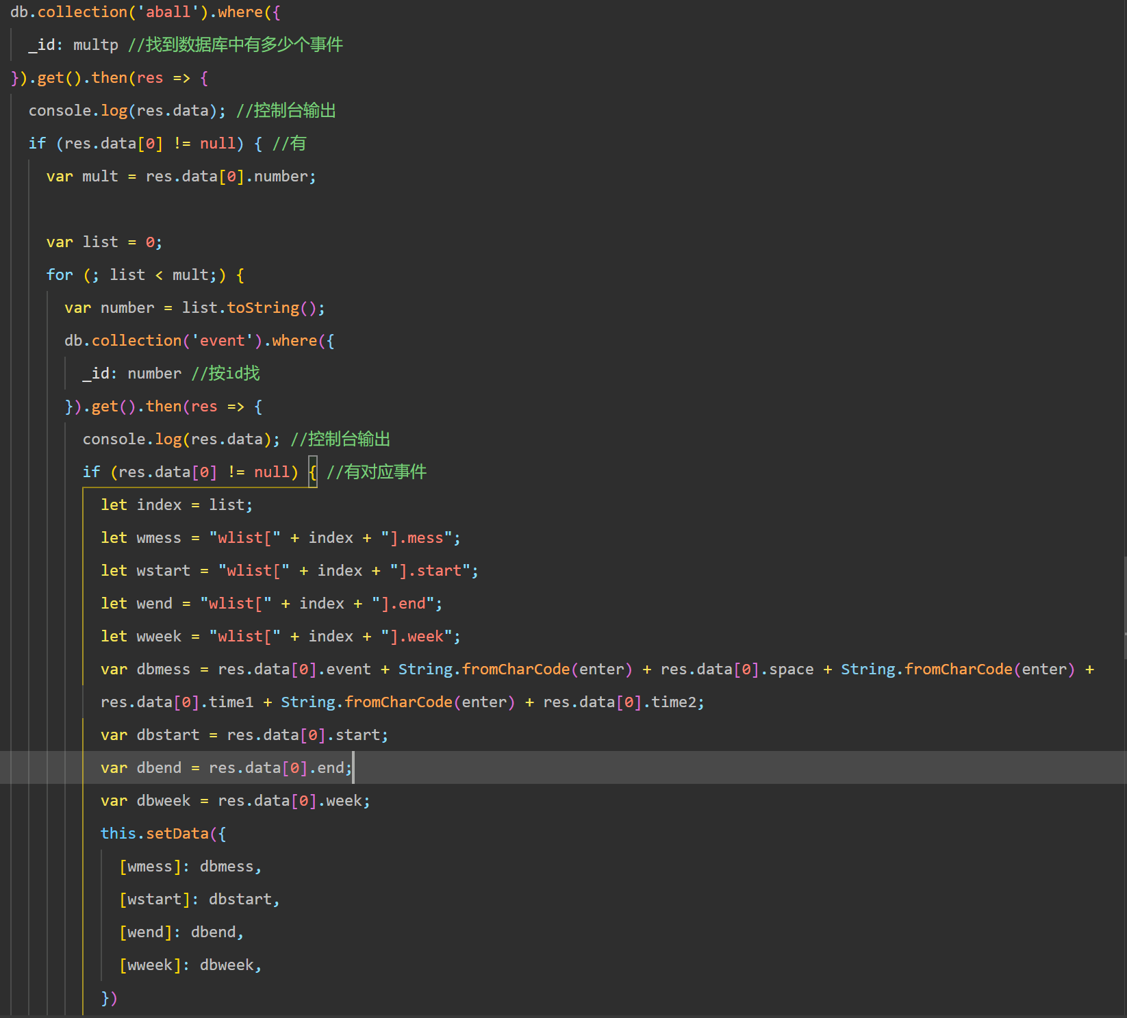 从数据库中的aball中获取事件的总个数number,在后面用mult表示,之后进入循环,用list表示当前遍历数组的位置,每一次将数据库event中id为list的部分数据赋给wlist数组的list中,后面的代码是网上学的动态分配数组以及渲染页面