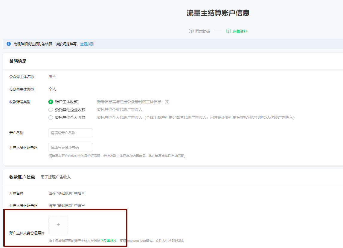 你好,流量主结算账户信息填写页面中的身份证上传入口只有一个,请将身份证正反面照片拼接后上传,谢谢。