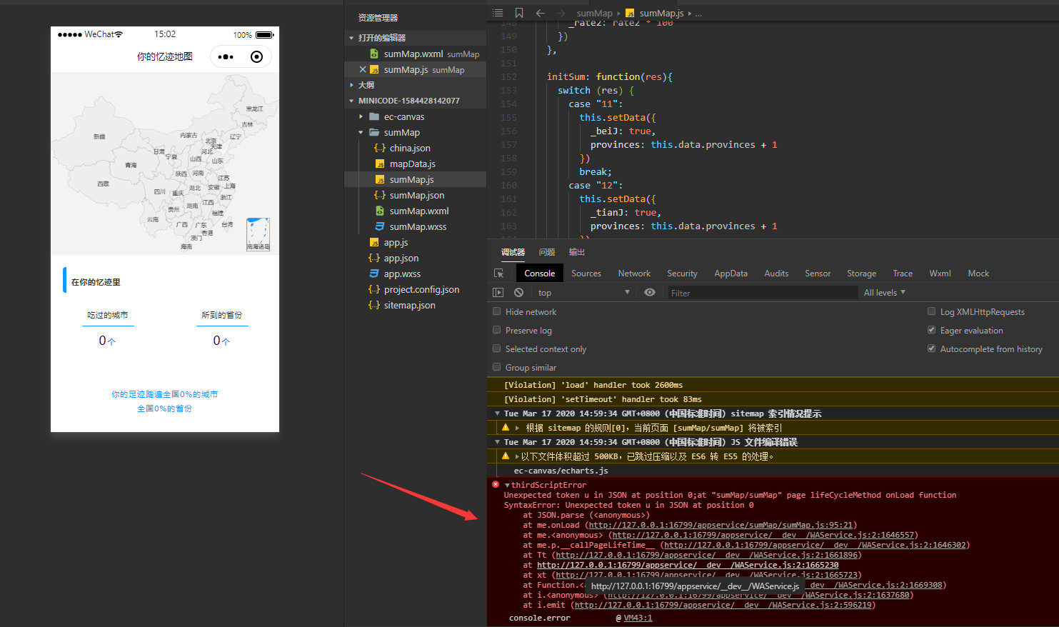 在小程序开发中,功能需要就在小程序中调用echarts画了幅地图。在开发者工具里正常查看地图,一切正常。