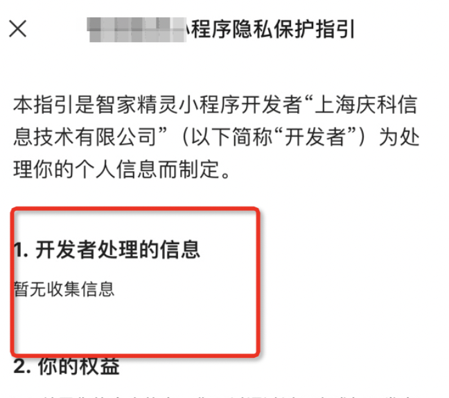 且审核通过后,小程序上打开隐私指引,开发者处理的信息:暂无收集信息。