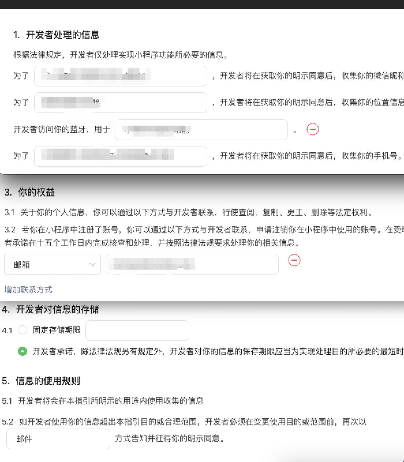 实际:在配置隐私保护指引时,已经填写了联系方式、和‘你的权益’ 部分内容。