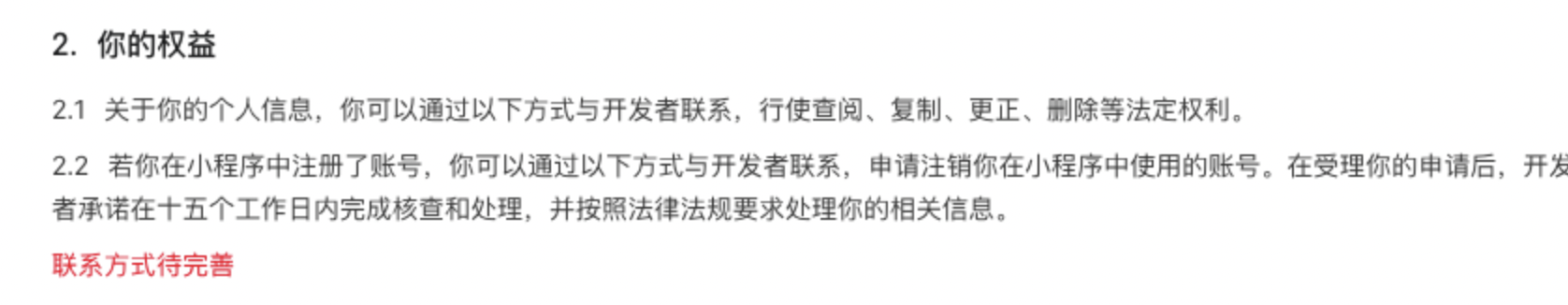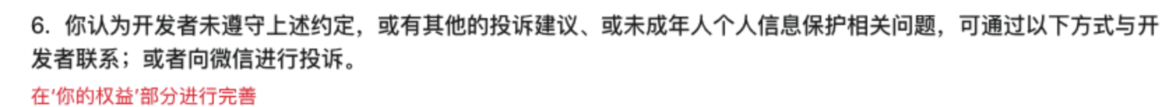 按流程进行隐私保护指引进行配置,配置完成后审核中查看提示:联系方式、你的权益需完善。