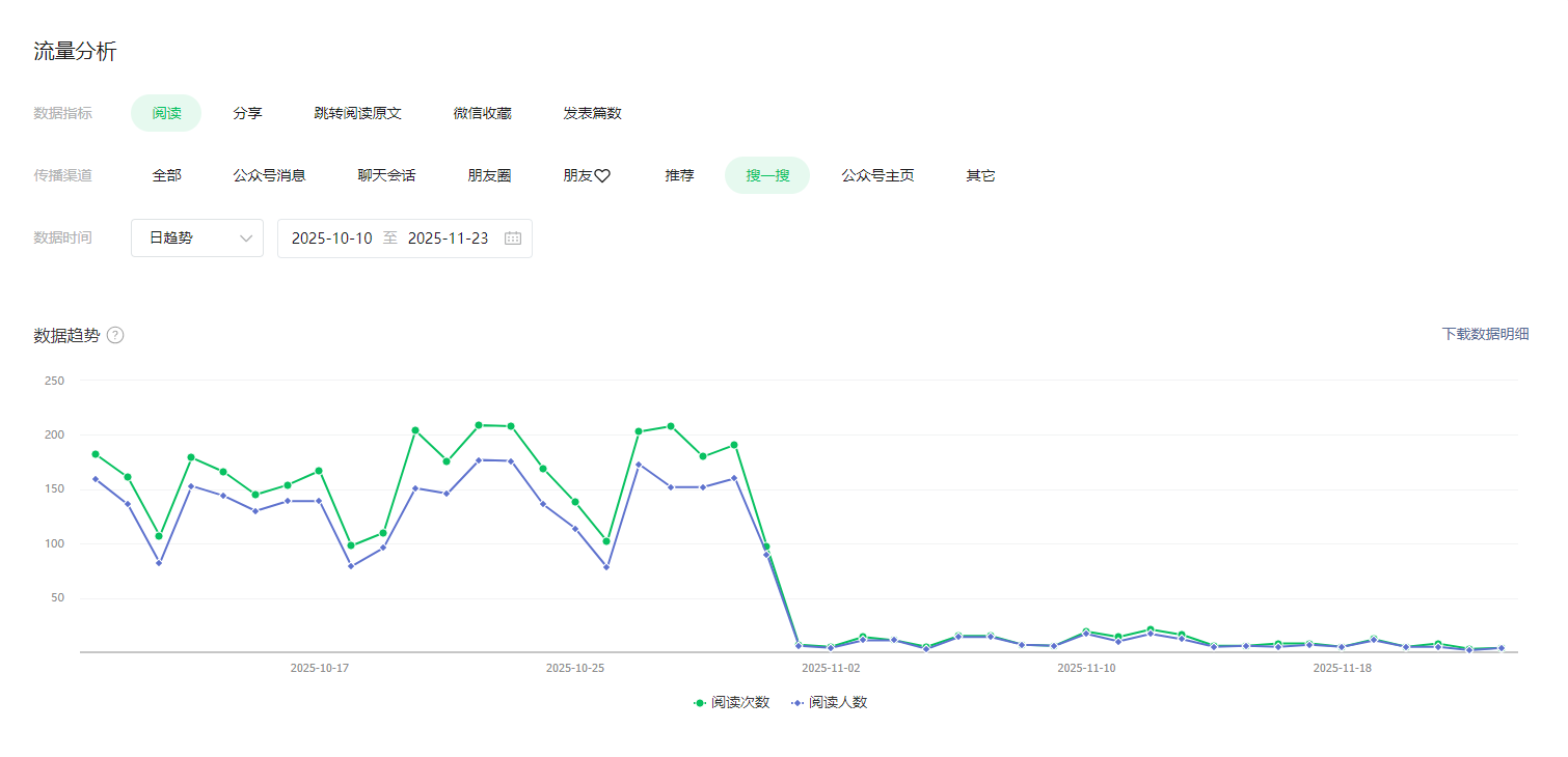 从11月01日起,公众号搜一搜流量断崖式下滑,发布文章都通过平台严格审核,一直遵守平台运营规则,且保持日更输出有价值的额文章,希望审核人员能重新核查一下我的账号,予以恢复公众号账号流量!