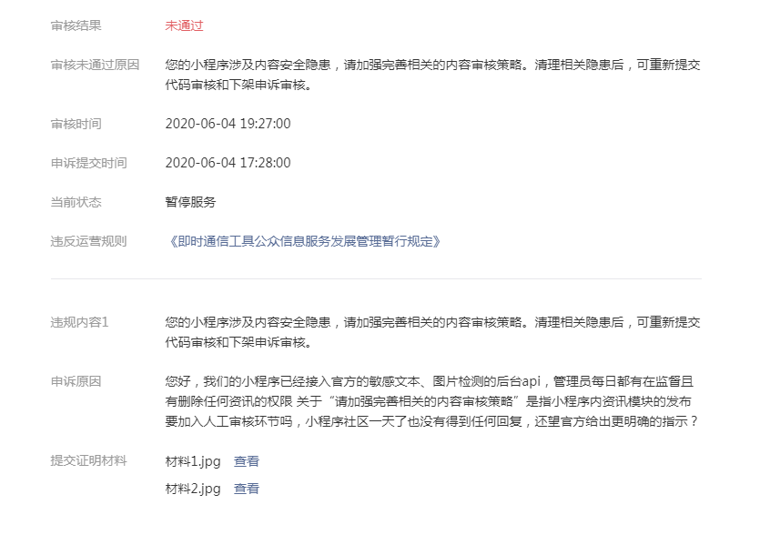 小程序有一个资讯模块,但是距上次审核通过已经有一段时间代码没有更新了,而且资讯发布后台也用了官方敏感文本、图片检测,一直也没有问题,那就不能指出是那个模板或页面或是功能上有问题?上去可就下架小程序了,那让怎么改?