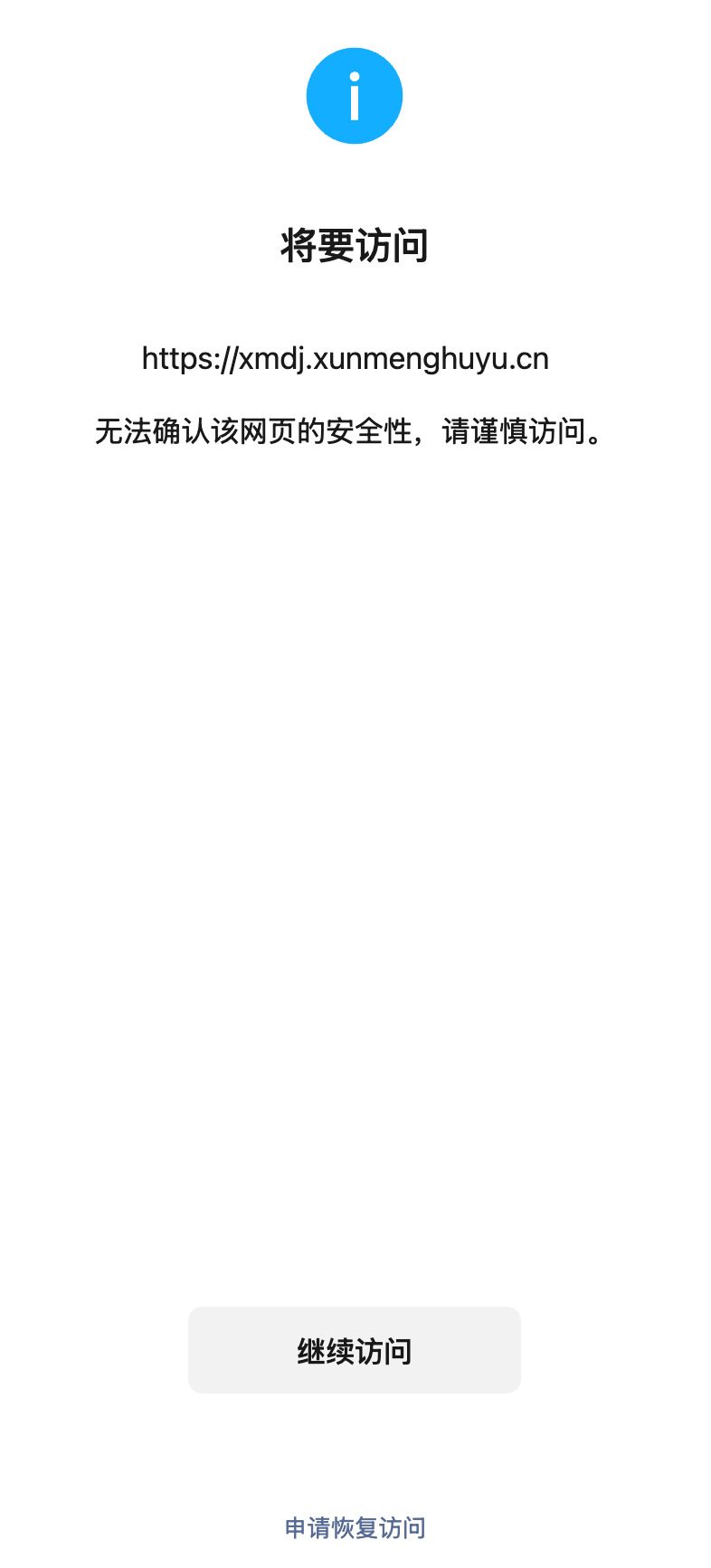 https://xmdj.xunmenghuyu.cn/#/,域名并未违规,但是在微信内访问被拦截,无法直接访问,需要能恢复直接访问