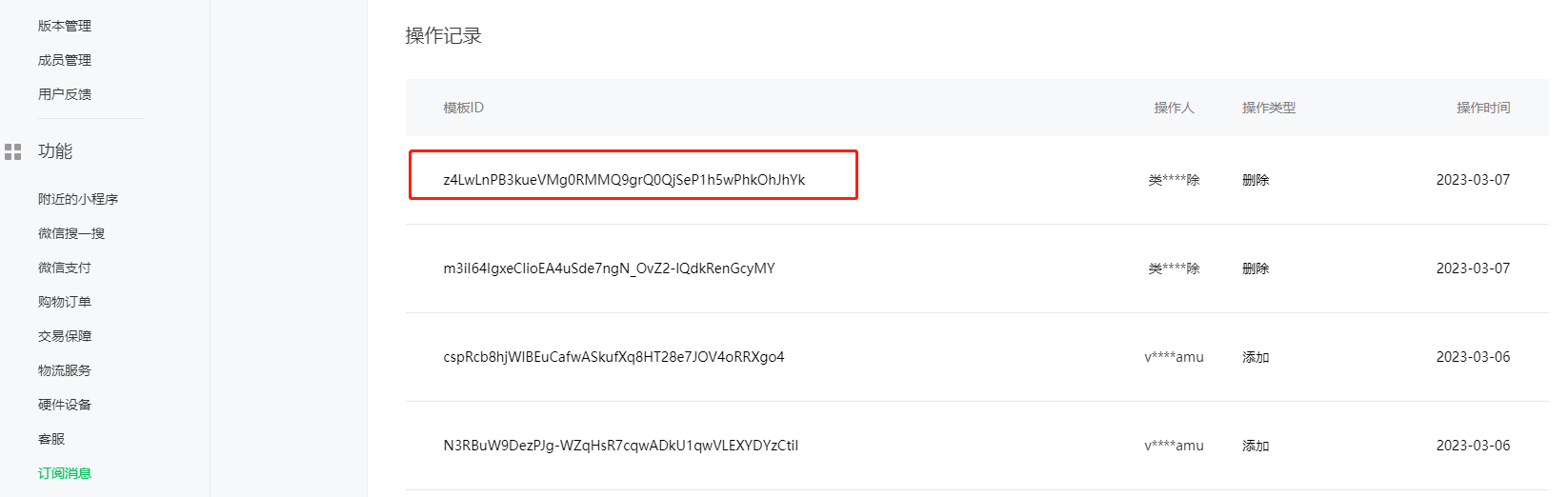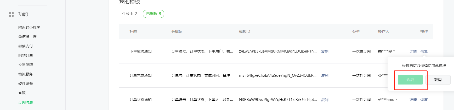 小程序订阅消息的模板,被删除了,恢复按钮不可用。