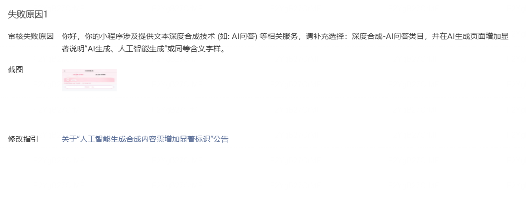 你好,你的小程序涉及提供文本深度合成技术 (如: AI问答) 等相关服务,请补充选择:深度合成-AI问答类目,并在AI生成页面增加显著说明“AI生成、人工智能生成”或同等含义字样。