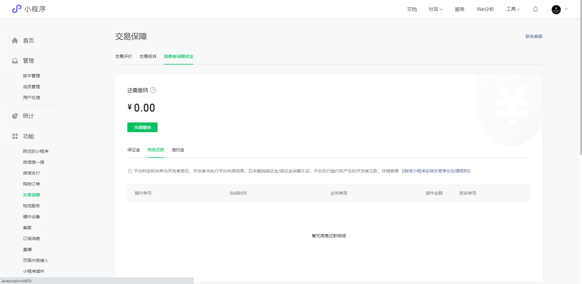 提示:你好,你的小程序"DangerousPeople官方商城"产生平台先行赔付行为,请通过管理后台“功能-交易保障-消费者保障资金”模块查看详情,完成还款。