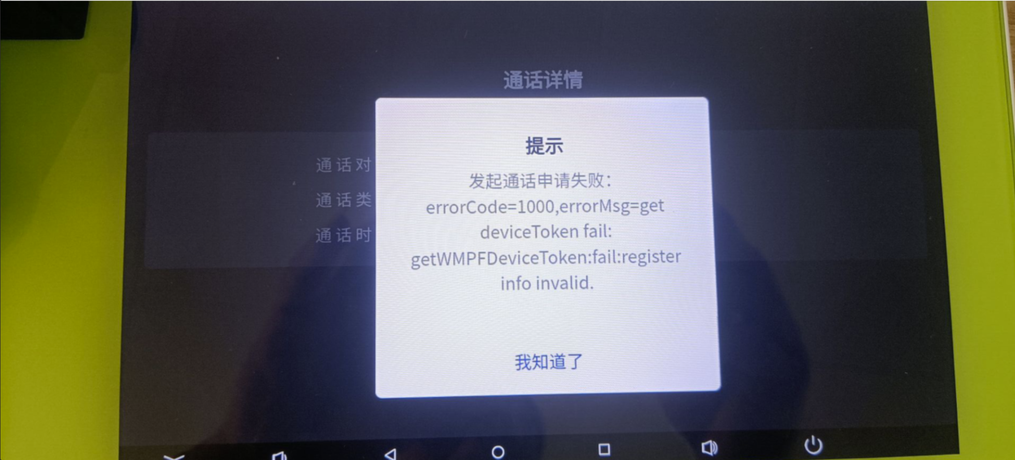 硬件设备上小程序呼叫手机端,初始化通话房间时报错: