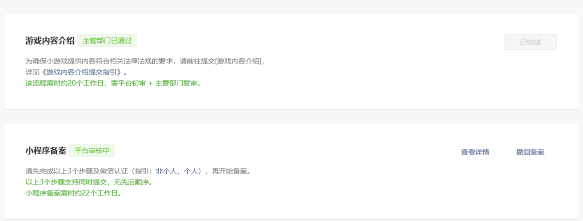 您好,我的这款小游戏之前由于小程序备案主体与运营主体不一致原因驳回,官方提供的那个问卷已经填写了,修改了介绍后一直没有收到审核通知,今天重新提交了小程序备案,麻烦运营同学帮忙看一下是否还需要做调整?