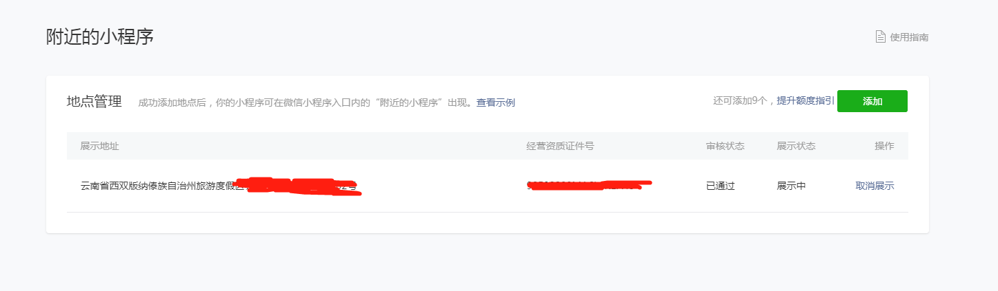 小程序已经上线,然后也提交了“附近小程序”,审核也通过了,可是手机上还是无法展示出自己上线的附近小程序? 而且也按照提示重新删除了展示地点重新提交了审核也通过了,还是无法在手机上看到自己“附近小程序”的小程序